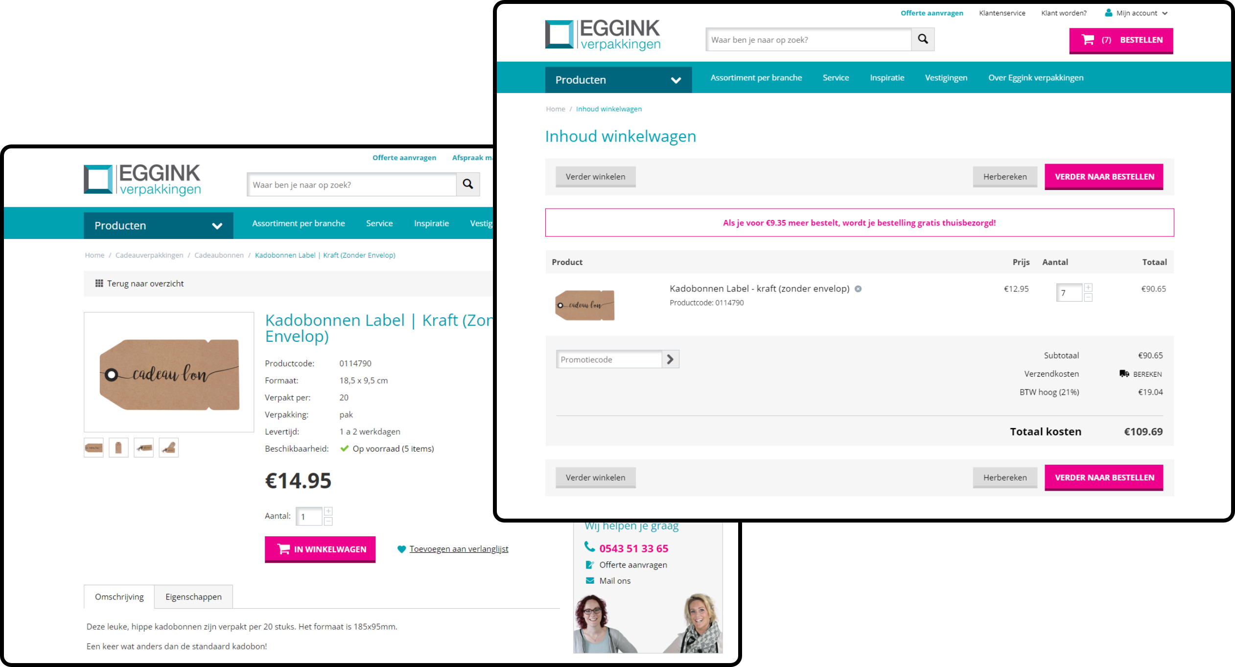 Normaal gesproken is het verhogen van de gemiddelde orderwaarde lastig te realiseren. Eggink verpakkingen hanteert verschillende niveau’s voor verzendkosten. Zo worden de bestelde producten gratis bezorgd bij klanten vanaf €100,- orderwaarde. Bij een bestelling onder de €100,- worden er wel verzendkosten in rekening gebracht. Dit gegeven hebben wij gebruikt om de bezoeker te motiveren om hun order te vergroten, mét behoud van het conversieratio.