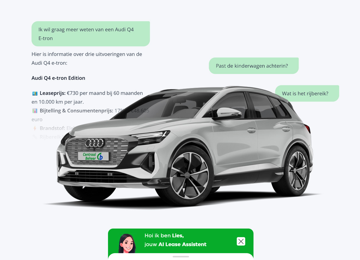 Om het keuzeproces voor leaseauto’s overzichtelijk en persoonlijk te maken, ontwikkelden Frontis en Perplex samen Lies: een digitale assistent die alles weet over lease en die bezoekers stap voor stap helpt bij het vinden van hun ideale auto. In plaats van eindeloos modellen vergelijken, stelt Lies een paar slimme vragen over gebruik, voorkeuren en praktische wensen.