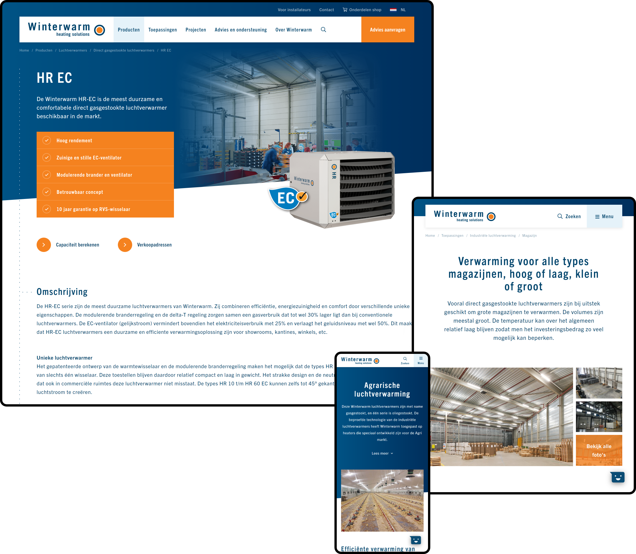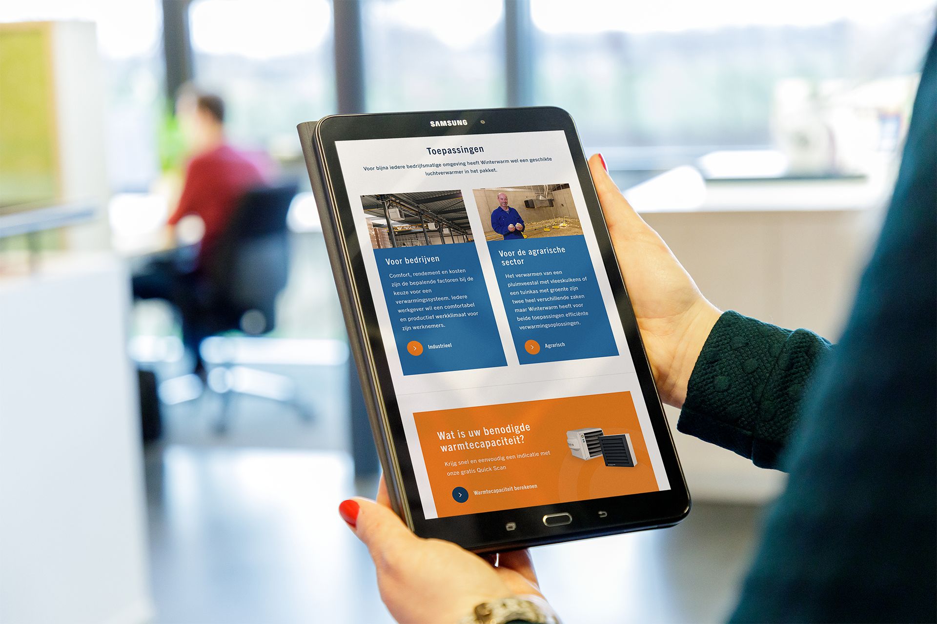 - De doelgroep van Winterwarm is divers: van eindgebruikers, groothandels en installateurs tot internationale dealers. Bovendien verschilt de buyer journey in Nederland ten opzichte van de export naar het buitenland én verschilt dit ook nog tussen de agrarische markt en de industrie. Kortom, de weg naar de eindgebruiker is altijd anders. Hoe ontwikkelen we een logische en gebruiksvriendelijke website voor al deze doelgroepen en hun behoeften?
