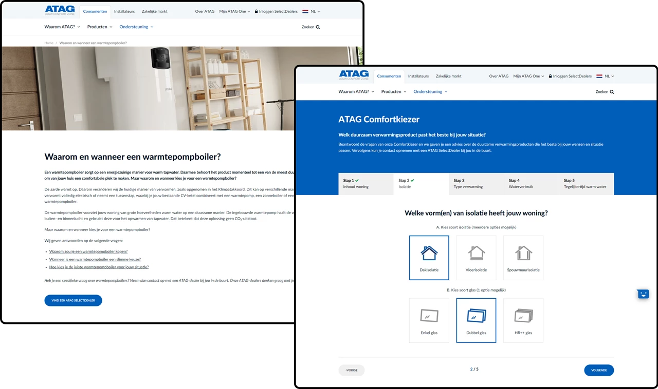 Sinds 2018 staat de huidige website van ATAG Verwarming live, die in meerdere talen aansluiting vindt op 3 doelgroepen: consumenten, installateurs en de zakelijke markt. De content is volledig afgestemd op de betreffende doelgroep en websitegebruikers maken volop gebruik van de Comfortkiezer, een gebruiksvriendelijke keuzehulp die op basis van een aantal simpele vragen een duurzaam advies op maat biedt.
