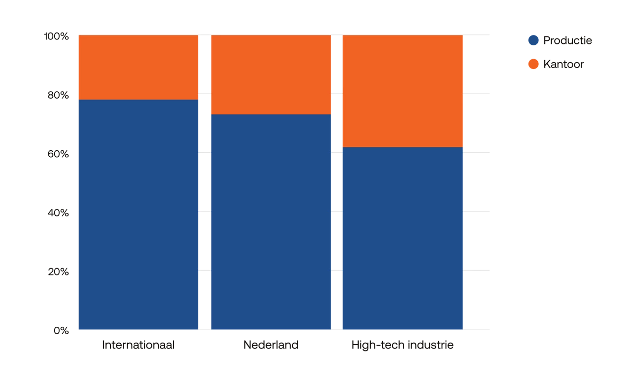 In de Nederlandse industrie groeit het aandeel kantoorpersoneel sneller dan het aantal mensen in de productie. In sommige sectoren, zoals hightech, is inmiddels 35 tot 40 procent van het personeel kantoorgebonden.