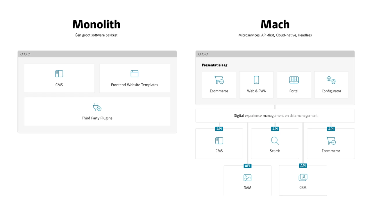 Wij zijn voorstander van ‘best-of-breed' oplossingen, ook wel het 'Mach' gedachtegoed: je kiest dan niet voor een groot pakket dat alles kan, maar specifieke pakketten die goed zijn in een bepaalde service. Deze verschillende services kun je vervolgens ontsluiten via een presentatielaag (zoals een klantenportaal). Zo ervaar je als gebruiker geen ‘hinder’ van verschillende systemen (bijvoorbeeld ERP, CRM en PIM) en profiteer je van de voordelen van standaard én maatwerk.